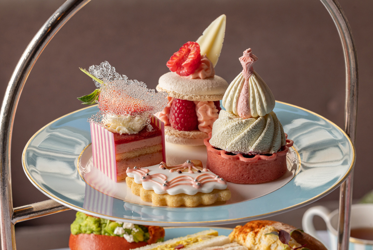 Savouries include refined finger sandwiches such as egg salad on brioche; French chicken tarragon on white bread; avocado purée, sundried tomatoes & crumbled feta on a savoury pink brioche roll; and pastrami, horseradish cream & baby rocket on hearty brown bread.